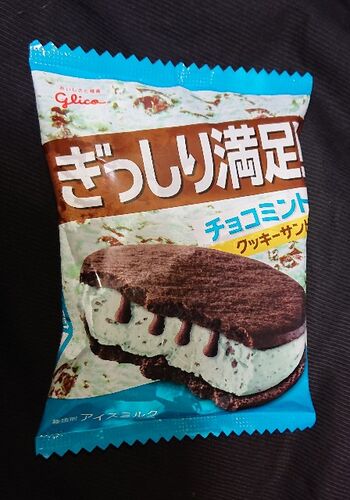 【グリコ ぎっしり満足!チョコミントクッキーサンド】を実際に購入して食べてみました。 【ジャンル】 (ブランド) ぎっしり満足シリーズ (メーカー) グリコ (カテゴリー) アイス商品、チョコ系アイス、ミント系 (2022年5月23日発売 約178円税込) ビターな味…
